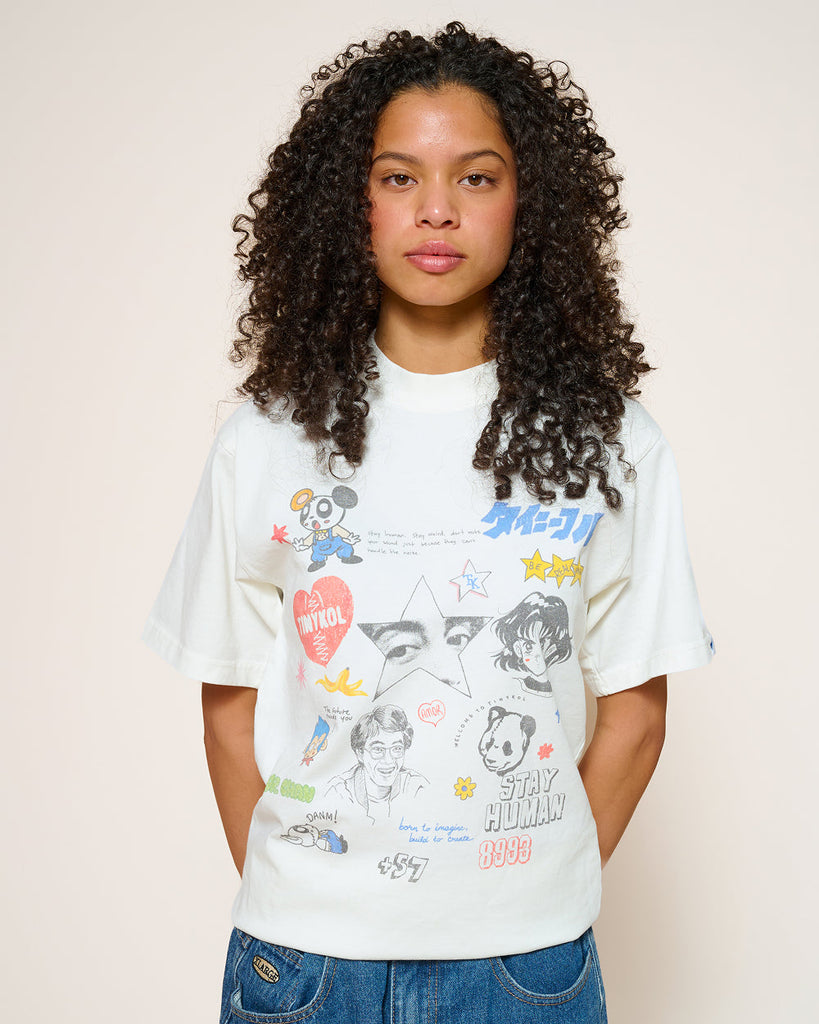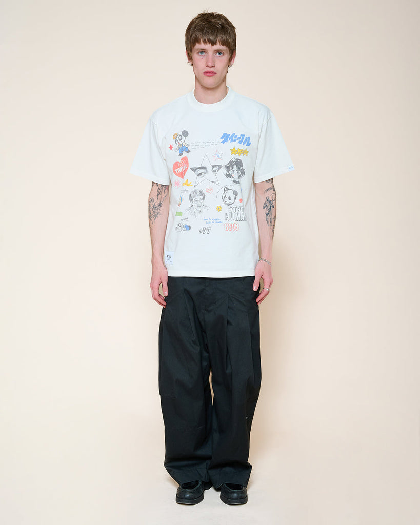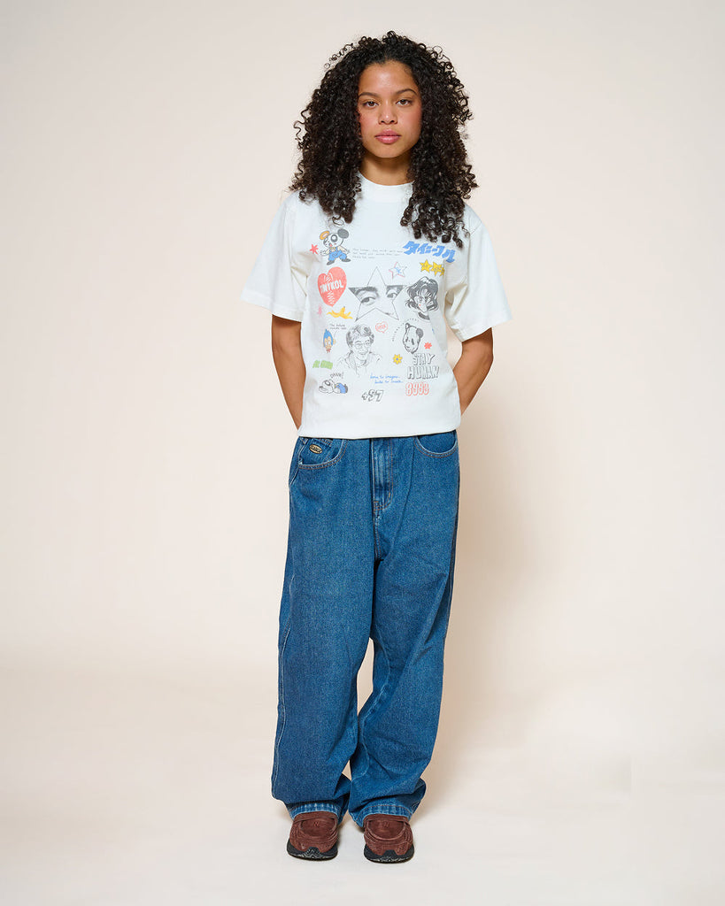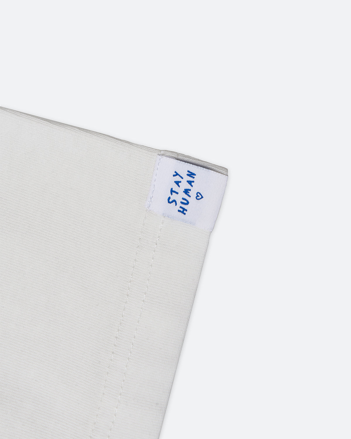 Digital printed graphic, Rubber label detailing, Pip label on sleeve, Woven hem label